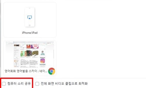 우선 줌에서 컴퓨터 소리 공유는 별도로 화면공유 시에 설정을 해주어야 한다.
