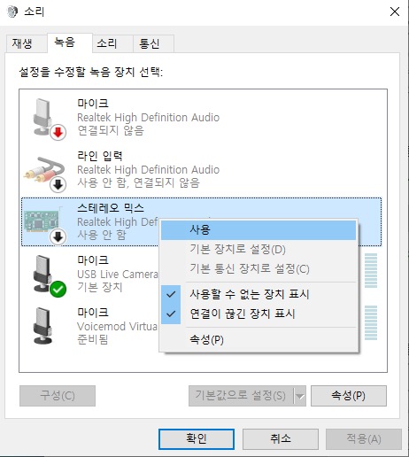 스테레오 믹스가 "사용"으로 설정되어 있는지 확인해본다.