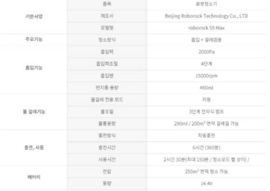 여전히 왜 로보락s5 max가 s6 pure보다 가격이 높은지, 구체적으로 어떤 성능이 좋은지찾기가 힘들어 직접 상세 스펙을 비교해보게 되었다.