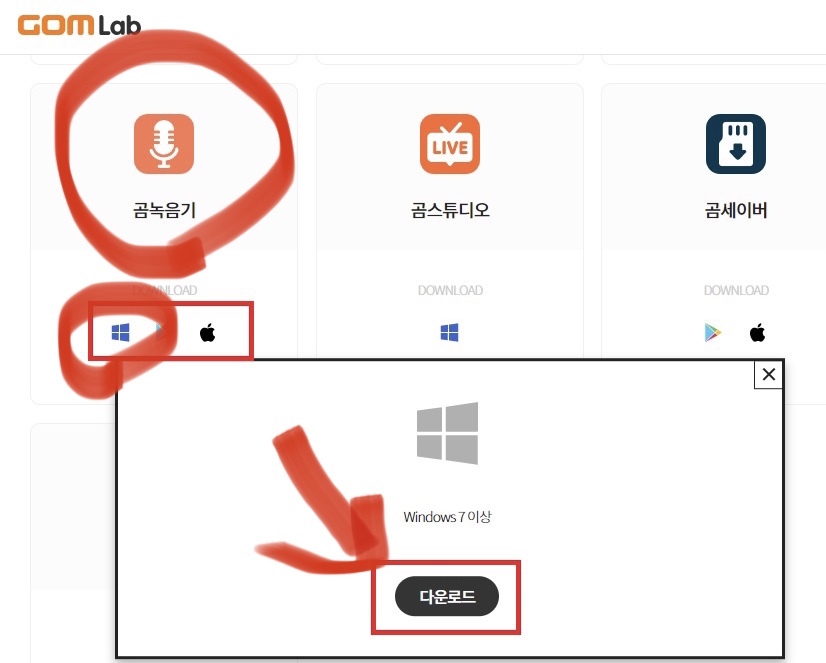 아래와 같이 곰녹음기의 윈도우 로고를 누르고 "다운로드" 버튼을 누르면 된다.