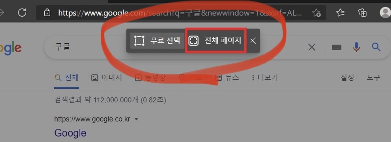 전체 페이지는 현재 인터넷 페이지 전체를 캡처하는 메뉴 기능이다.