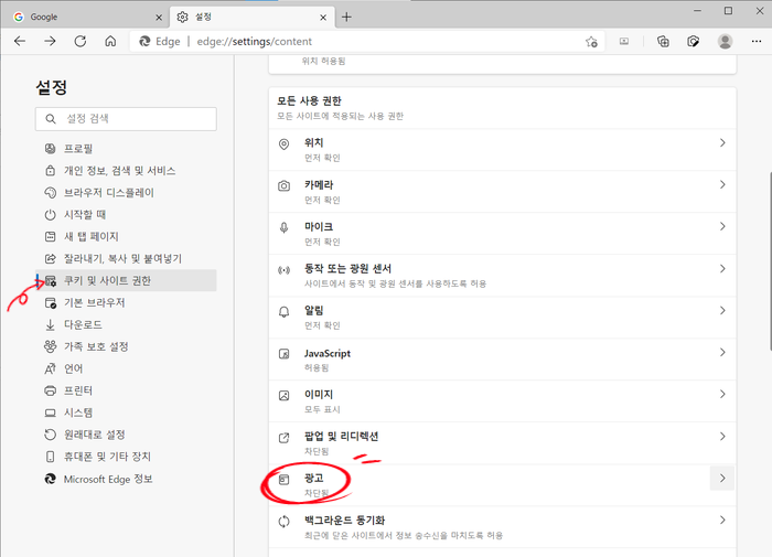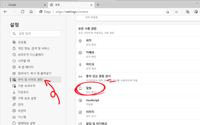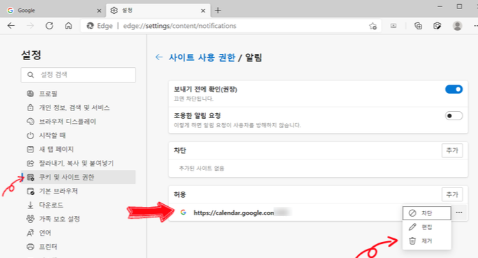 엣지에서 알림과 광고항목에서 허용된 사이트 제거를 진행하면 된다.