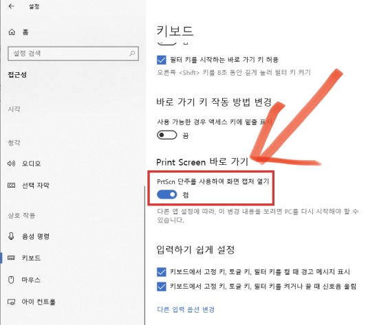 키보드 메뉴에 들어간 후 스크롤을 아래로 내리면 Print Screen 바로가기 부분에