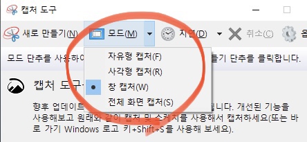 여기에서도 아래와 같이 자유형, 사각형, 창 캡쳐, 전체화면 캡쳐 기능을 사용할 수 있다.