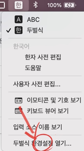 1) 맥os 우측상단의 "한/영 전환"버튼을 선택한 다음 아래에 있는 "두벌식 환경설정 열기"를 눌러 키보드 설정 화면을 연다.