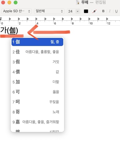"가치"라는 글자를 입력한 다음 단축키(option+enter)를 누르면