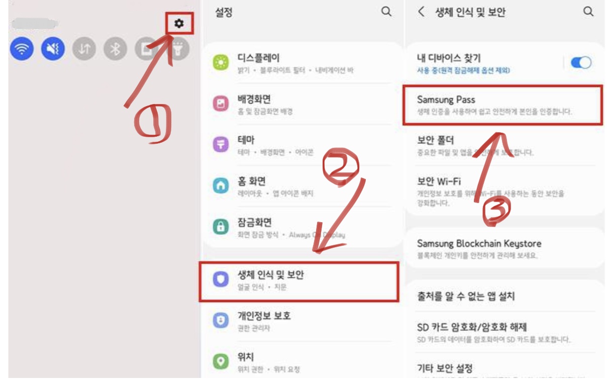 # 참고로 갤럭시 모델에 따라 설정 항목 이름이 다를 수 있는데 "생체인식 및 보안" 탭이 나타나지 않는다면, "잠금 화면 및 보안" 탭에서 삼성 패스를 찾을 수도 있다.