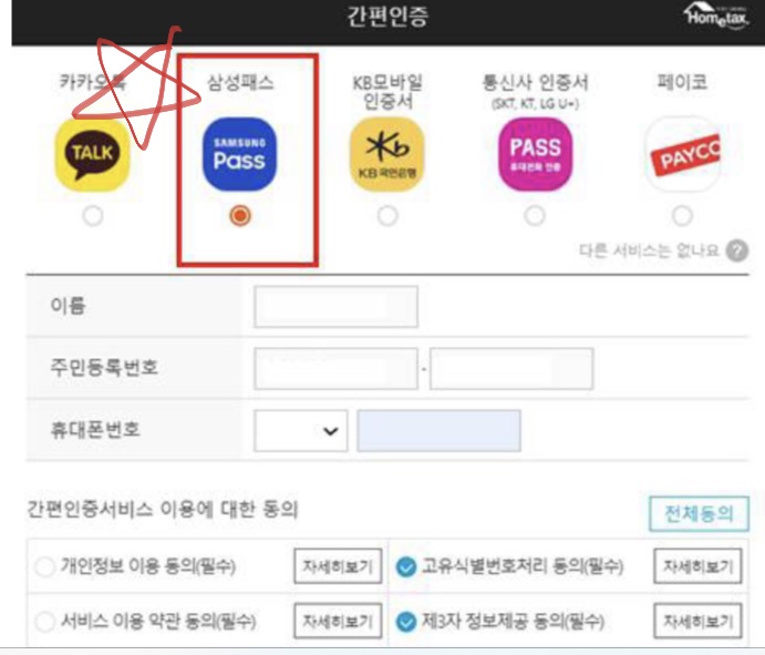 국세청 홈택스 등 PC 공공 웹사이트에 접속할 때, 아래와 같이 간편인증서 로그인 방법에서 "삼성패스"를 선택한 다음 이름 , 주민등록번호, 휴대폰 번호 등을 입력 정도로 인증이 가능하다.