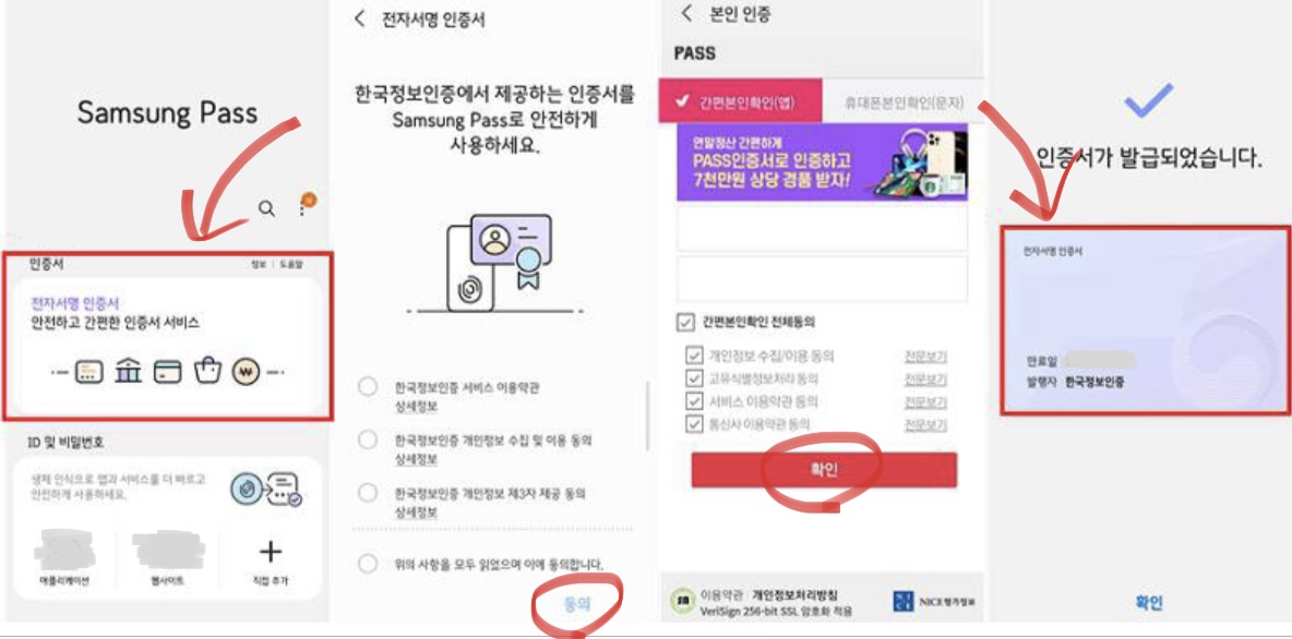 4. 삼성 패스 화면이 나타나면 전자서명 인증서를 누른다. 이용약관과 개인정보 수집 항목을 확인한 다음 휴대폰 본인인증을 진행하면 인증서가 발급된다.