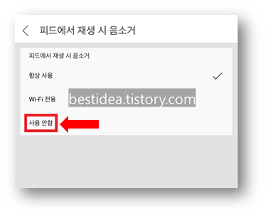 5. 피드에서 재생 시 음소거 부분을 사용안함 또는 와이파이에서 연결할 경우에만 재생되도록 할 경우에는 "wi-fi 전용"을 선택해준다.