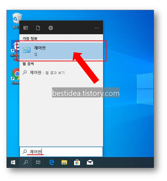 1. ahnlab safe transaction 삭제를 위해 우선 좌측하단 돋보기 버튼을 눌러 "제어판"을 입력하고 검색하여 실행한다.