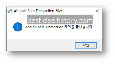6. 정상적으로 ahnlab safe transaction 삭제 프로세스 진행이 완료되면 아래와 같이 팝업창이 나타난다.