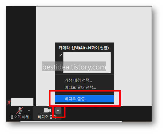(1) 우선 줌 회의를 시작한 다음, 좌측 하단에 있는 비디오 "비디오 중지(당연히 카메라를 켠 상태이므로 시작이 아니라 중지임)"옆에 있는 위쪽 방향의 화살표 모양의 아이콘을 누른 다음 비디오 필터 선택 아래에 있는 "비디오 설정"을 선택해준다.