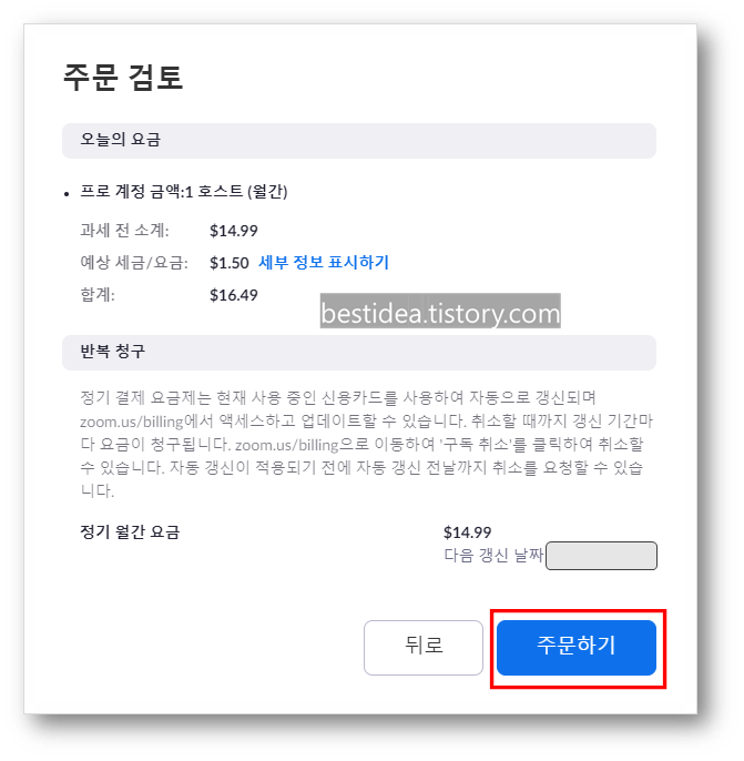 줌 프로의 경우 기본 요금이 14.99불이지만 세금이 더해져 16.49불이 결제된다. 한화로 약 2만원 정도가 되지 않을까 싶다.