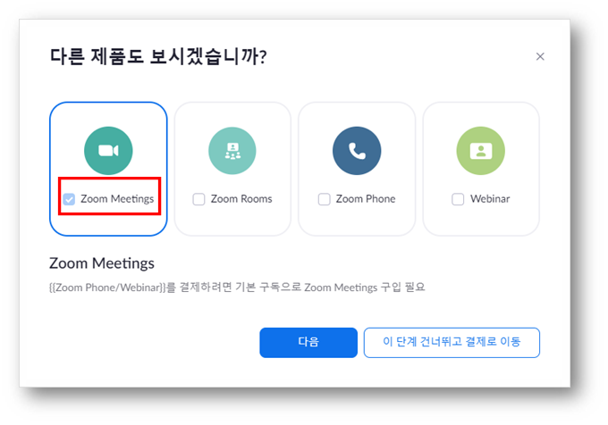 5. 다른 제품에 대한 권유가 뜨는데 그냥 Zoom Meetings만 선택된 상태에서 이 단계 건너뛰고 결제로 이동을 누르는 것을 추천한다.