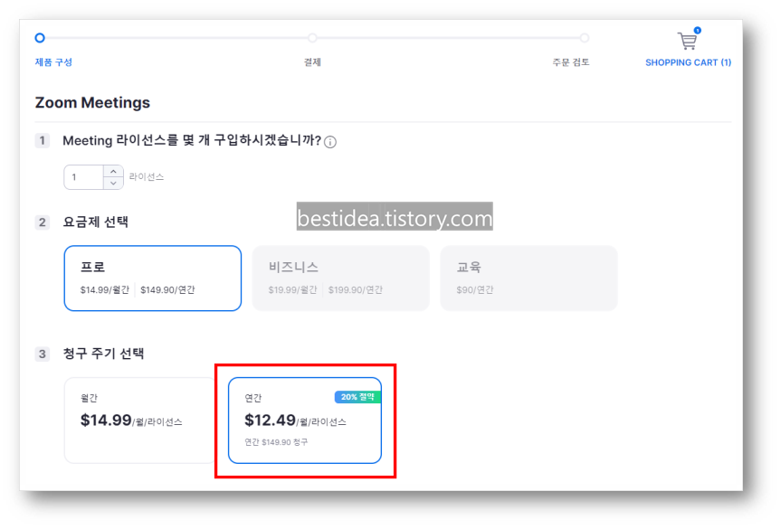 중요한게 청구 주기인데 줌에서 기본설정으로 연간으로 해두었다. 아무 생각없이 넘기면 연간으로 결제가 진행되니 주의해야 한다.