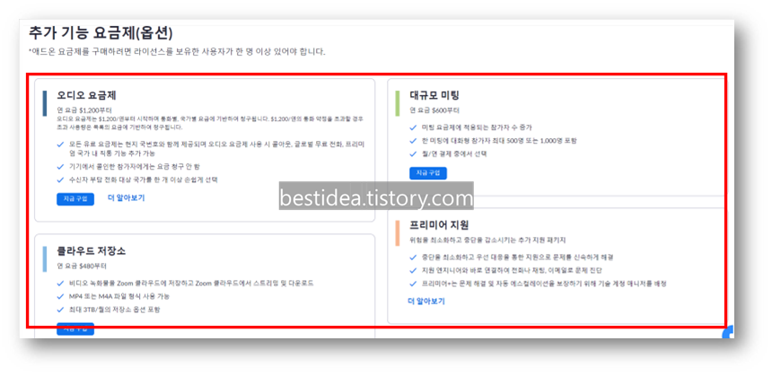 이 외에 줌 대규모 엔터프라이즈급 요금제가 있는데 아마 중기업 이상 대상이며 가입 금액은 협의가 필요해보인다.