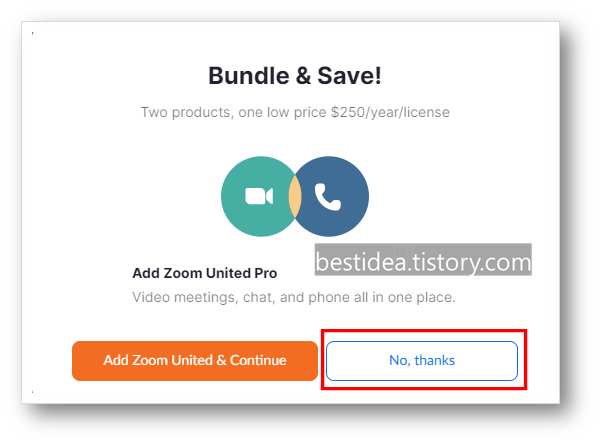 4. 그 다음에는 줌 유료결제 낚시질의 연속이다. 우선 애드온요금제(추가 요금제)에 대한 부분인데 "No, thanks" 등을 눌러 넘긴다.