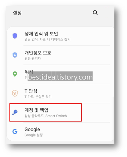 2. 그 다음 설정 화면에서 "계정 및 백업" 항목을 선택한다.