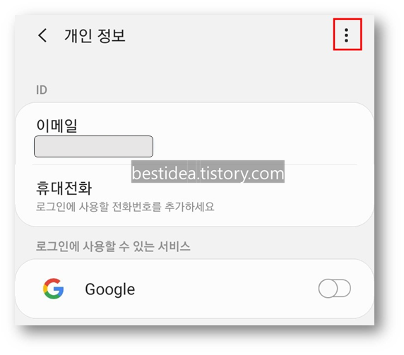 6. 개인 정보 화면이 나타나면 우측 상단에 있는 점 세개 아이콘 - 더보기 버튼을 누른다.
