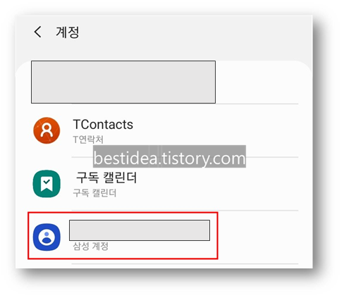 4. 그 다음 계정 화면에서 갤럭시폰과 연결된 여러 가지 계정 리스트들이 나타난다. 여기에서 "삼성 계정"이라고 하단에 적혀있는 항목을 찾아 선택해준다.