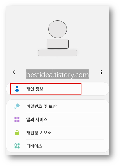 5. 삼성계정 항목에 들어가서 맨 위에 있는 "개인 정보"로 들어가면 삼성계정 로그아웃 / 탈퇴 메뉴를 찾을 수 있다.