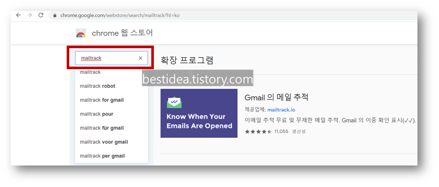 2. 크롬 웹스토어 메인화면이 나타나면 좌측 검색 창에 "mailtrack" 이라고 입력하고 검색한다.