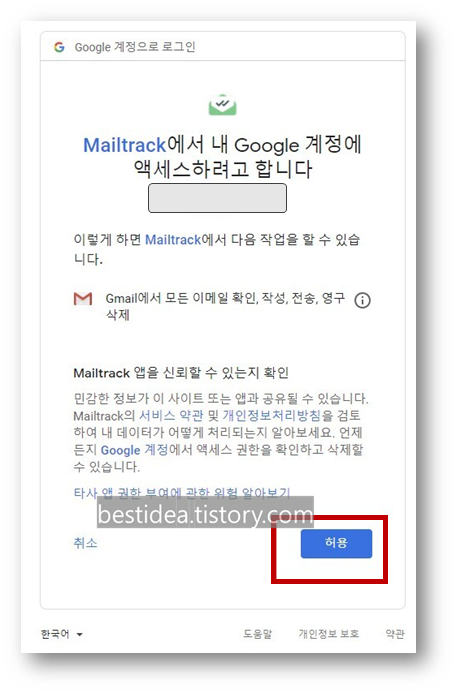 6. 지메일 수신확인이 필요한 계정을 선택하면 아래와 같이 액서스 허용 관련하여 허용을 해주어야 한다.