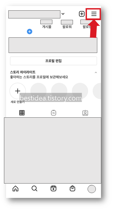 본인의 프로필 화면이 나타나면 우측 상단에 있는 작대기 세개 더보기 메뉴 아이콘을 선택한다.