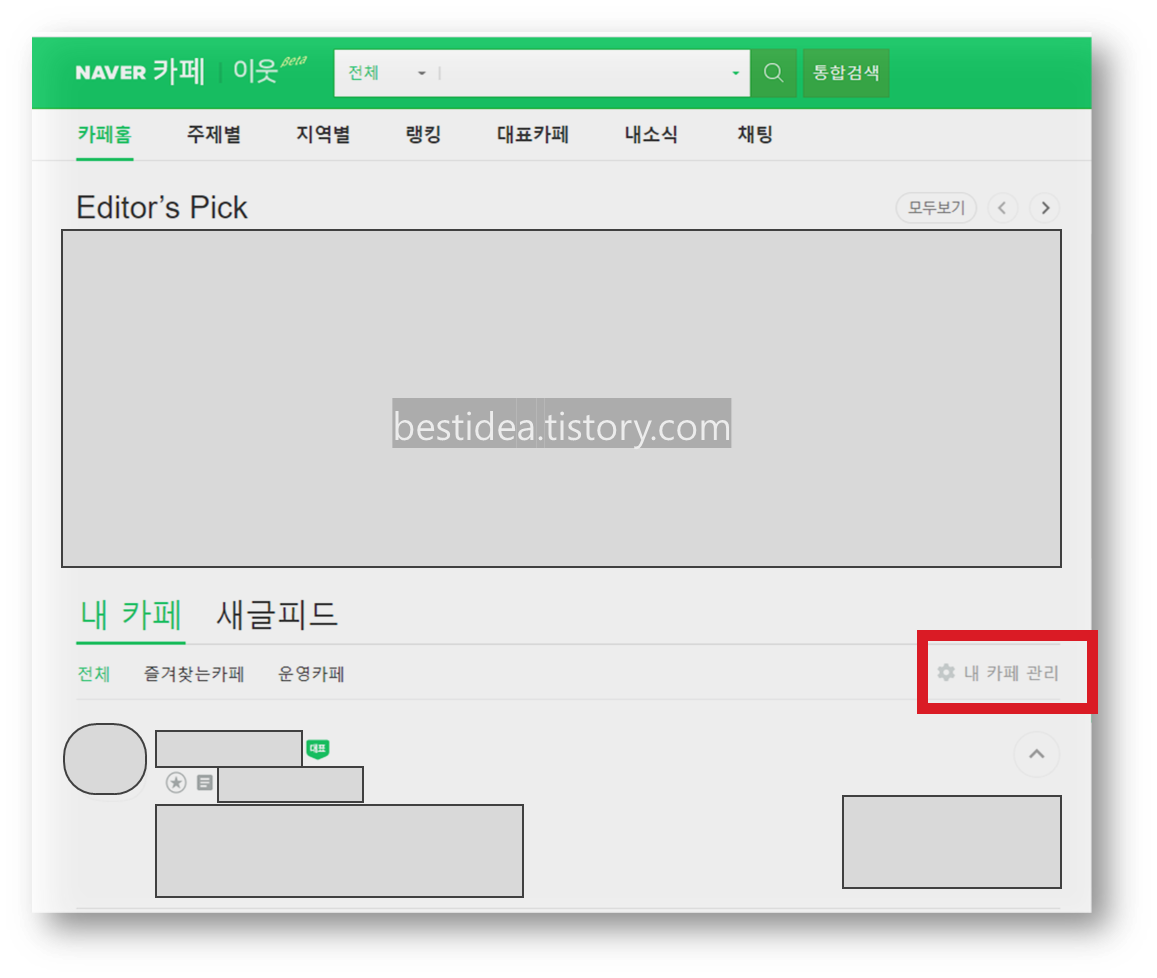 2) 네이버 카페 가입 리스트가 나타나는데 여기서도 아래 표시한 부분과 같이 "내 카페 관리"라고 희미하게 적힌 텍스트 버튼을 선택해준다.