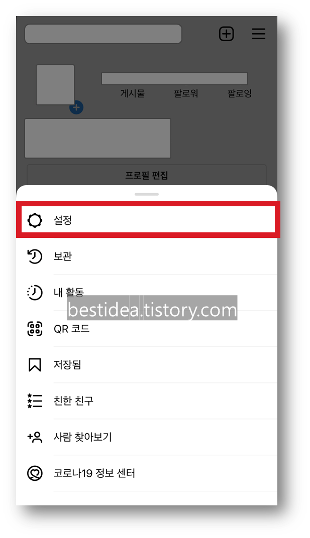 2. 하단에 메뉴가 나타나면 가장 위에 있는 "설정" 버튼을 선택한다.