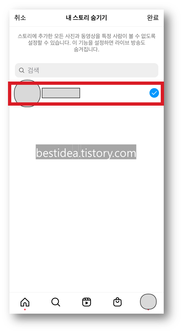 6. 내 스토리 숨기기 화면이 나타나면 검색 창에서 나를 팔로우 하는 팔로워 중에서 내 스토리를 숨기기하고 싶은 대상을 선택해주고 우측 상단에 "완료" 버튼을 눌러주면 된다.