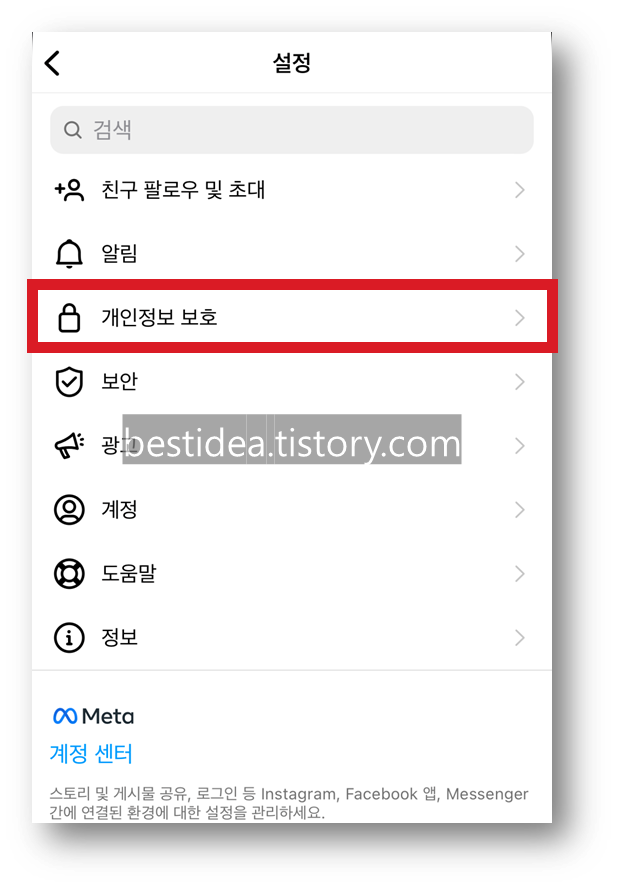 3. 설정 화면이 나타나면 아래와 같이 "개인정보 보호"를 선택한다.