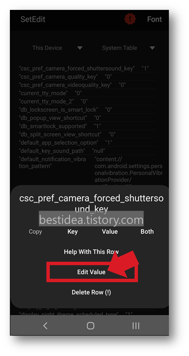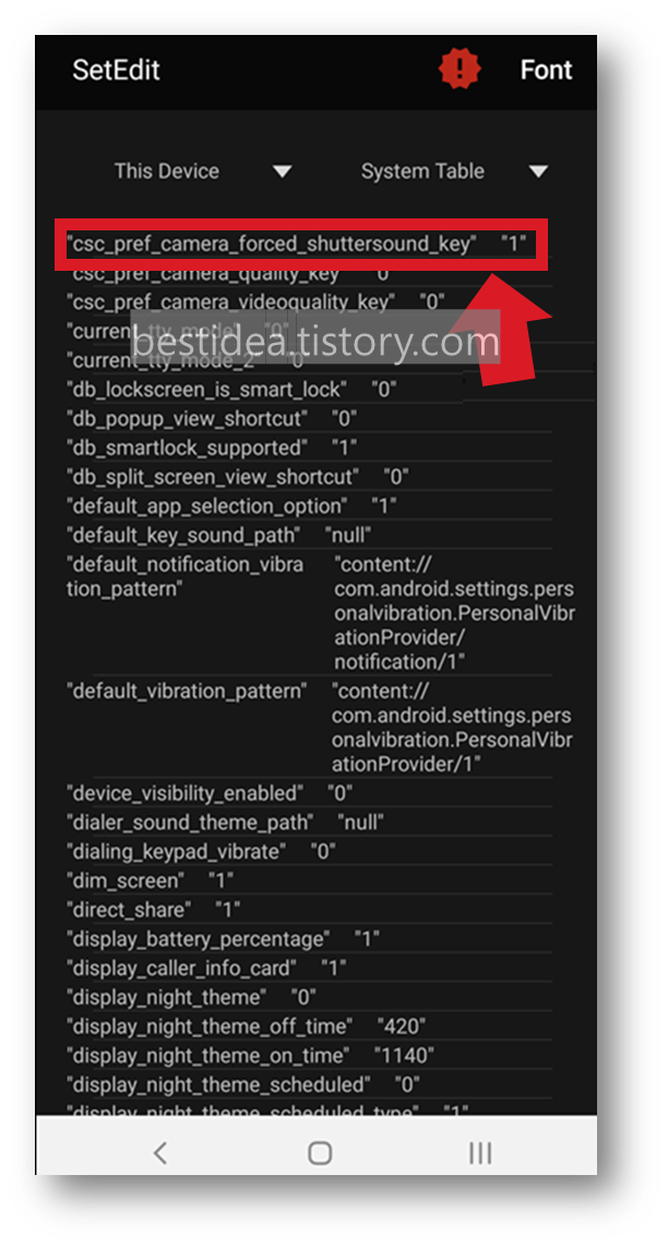 참고로 앞선 SetEdit 설정 화면에서 Edit Setting 화면에서 csc_pref_camera_forced_shuttersound_key을 "1"로 복원하고 "Save Changes"를 입력하면 다시 카메라음 관련 csc 코드가 추가되어 원상복구된다.