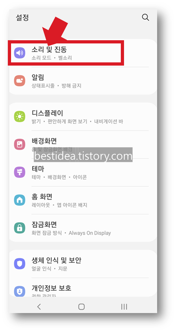 갤럭시 앱에서 아래와 같이 기본 설정앱을 실행한 다음 "소리 및 진동"을 선택한다.
