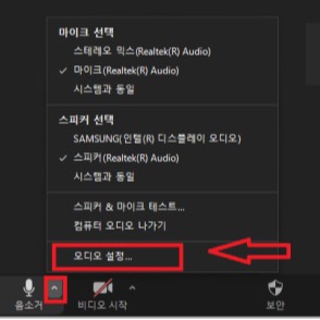 2. 줌 다운로드 및 실행 후 좌측하단 음소거 옆의 화살표를 눌러 "오디오 설정"을 눌러준다.