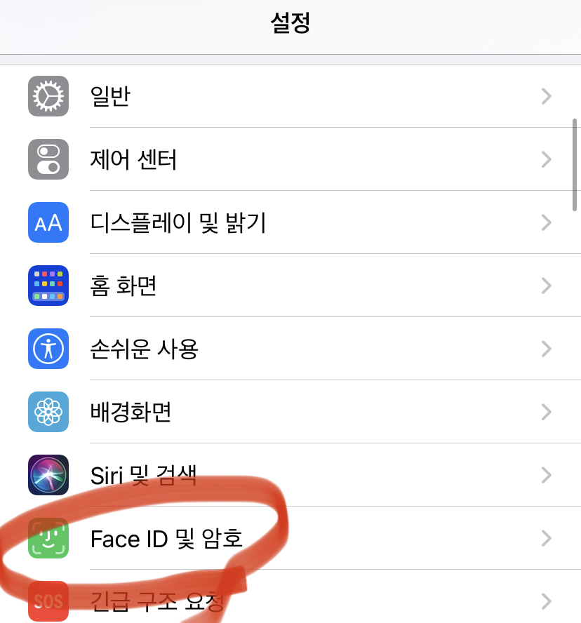 설정 유틸리티에서 화면 바를 아래로 스크롤해서 "Face ID 및 암호" 을 선택한다.