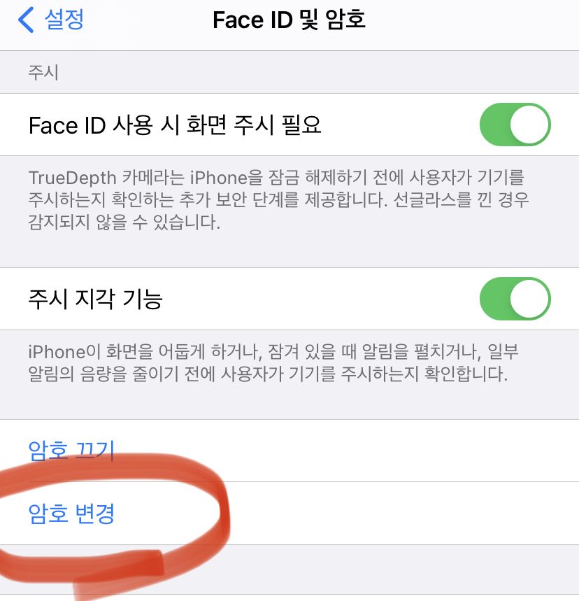2. 해당 "Face ID 및 암호" 화면에서 아래로 다시 스크롤을 내린 후 "암호 변경"을 선택한다.