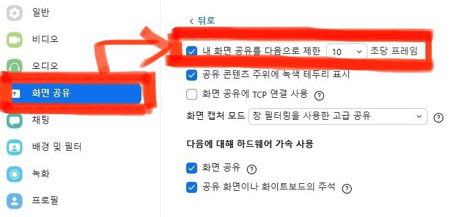 "내 화면 공유를 다음으로 제한" 앞에 초당 프레임 "10" 또는 "15"로 설정