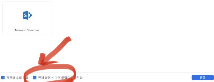 2. 혹시 위와 같이 "전체 화면 비디오 클립으로 최적화" 체크를 못한 상태에서 화면공유가 시작되었다면